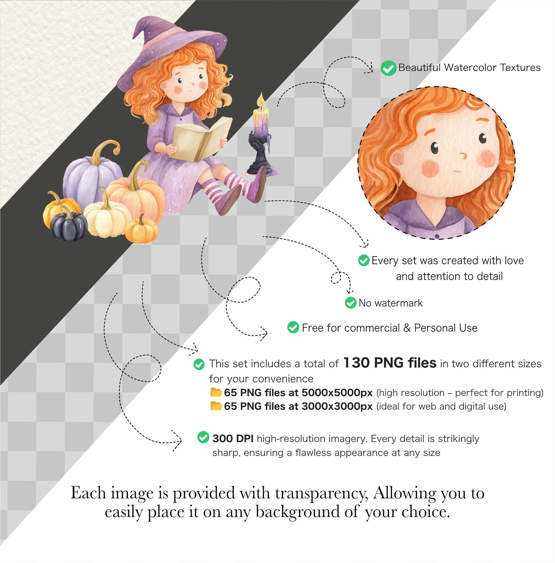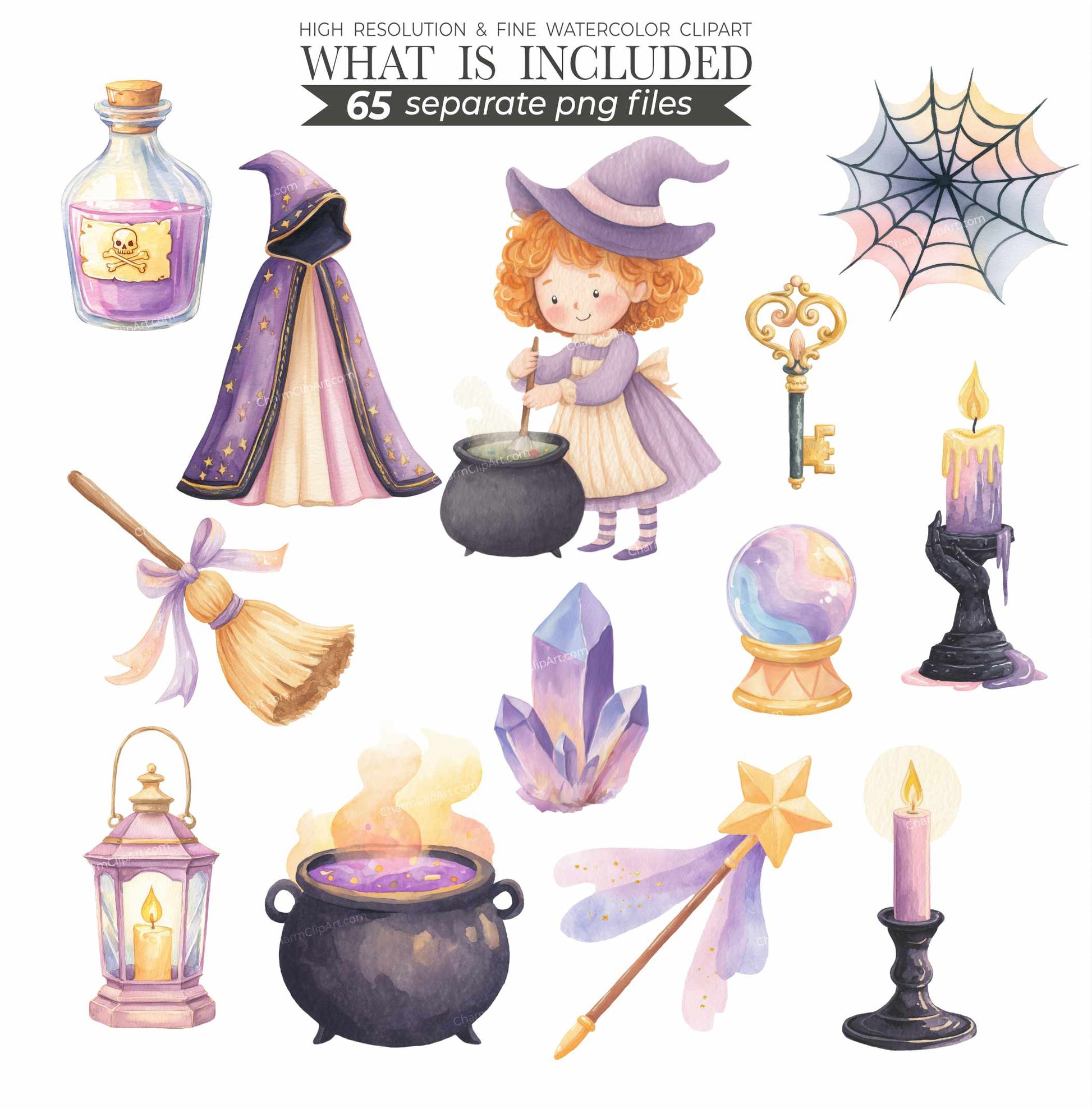 65 high-quality PNGs featuring adorable little witches in pastel purple tones, paired with Halloween elements like pumpkins, potions, bats!