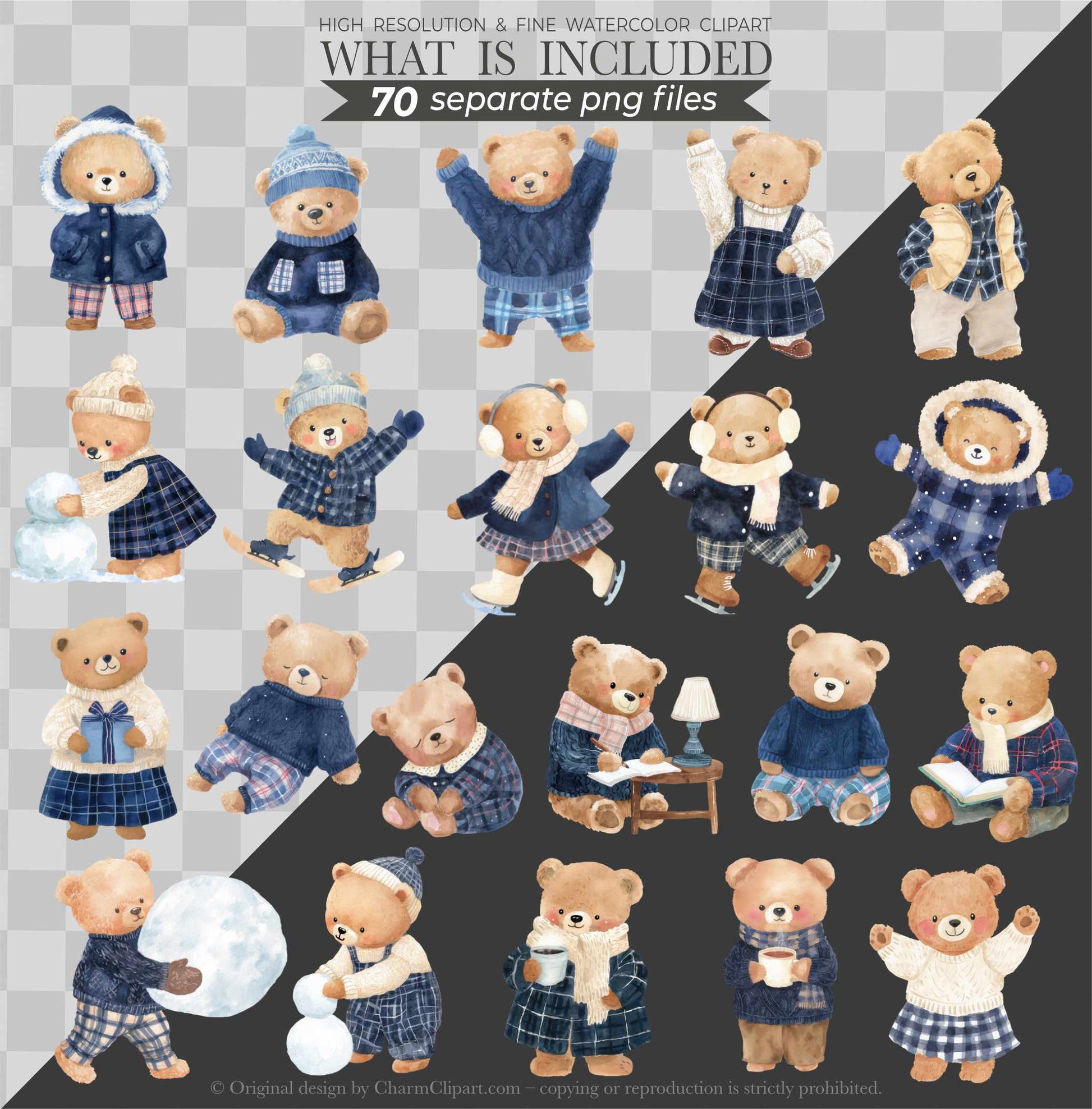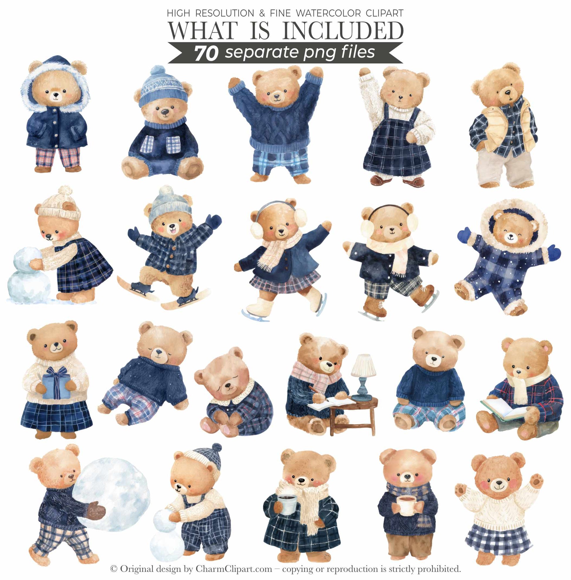FROSTY COZY BEARS – BLUE PLAID WINTER WATERCOLOR TEDDY CLIPART (70 PNGs