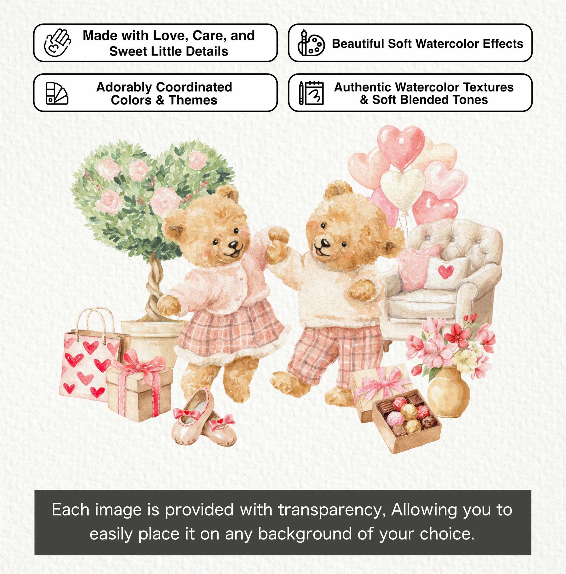 Fill your designs with romantic charm and soft pastel magic. Sweetheart Bear Moments is a delightful watercolor clipart collection featuring adorable teddy bears dressed in blush outfits, heart-filled accessories, and cozy vintage Valentine details.