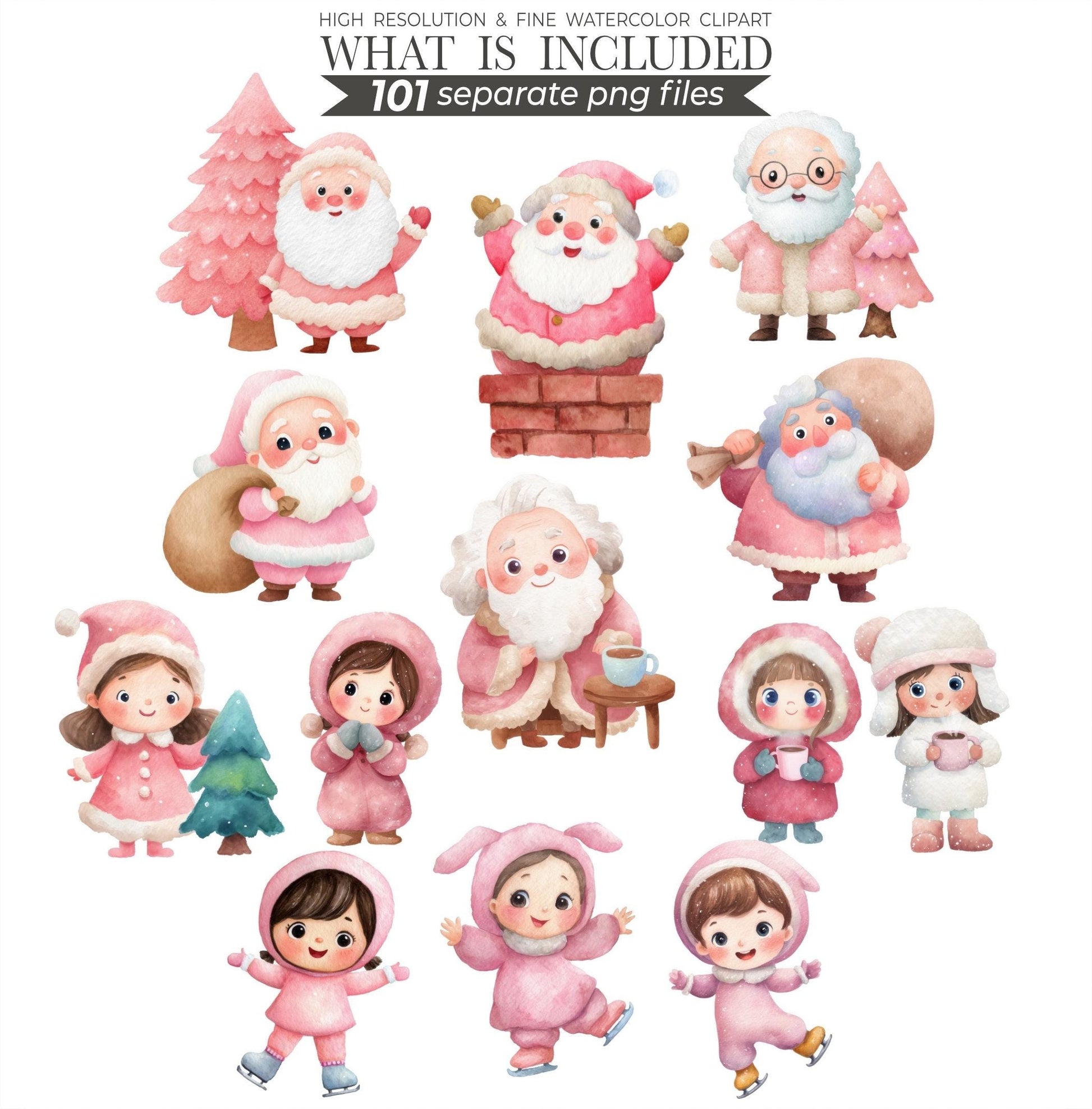 Pink Christmas Clipart: Watercolor Santa, Reindeer, Snowman (101 PNGs) (Commercial Use)