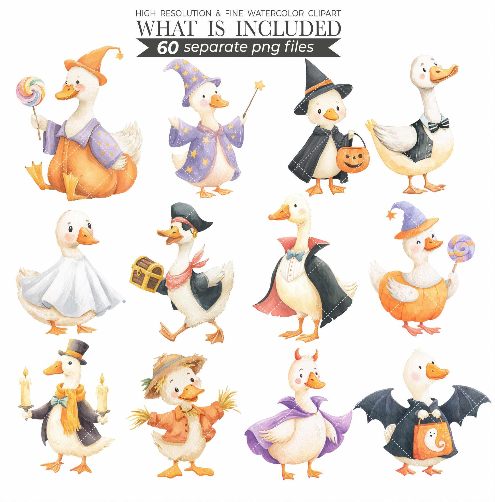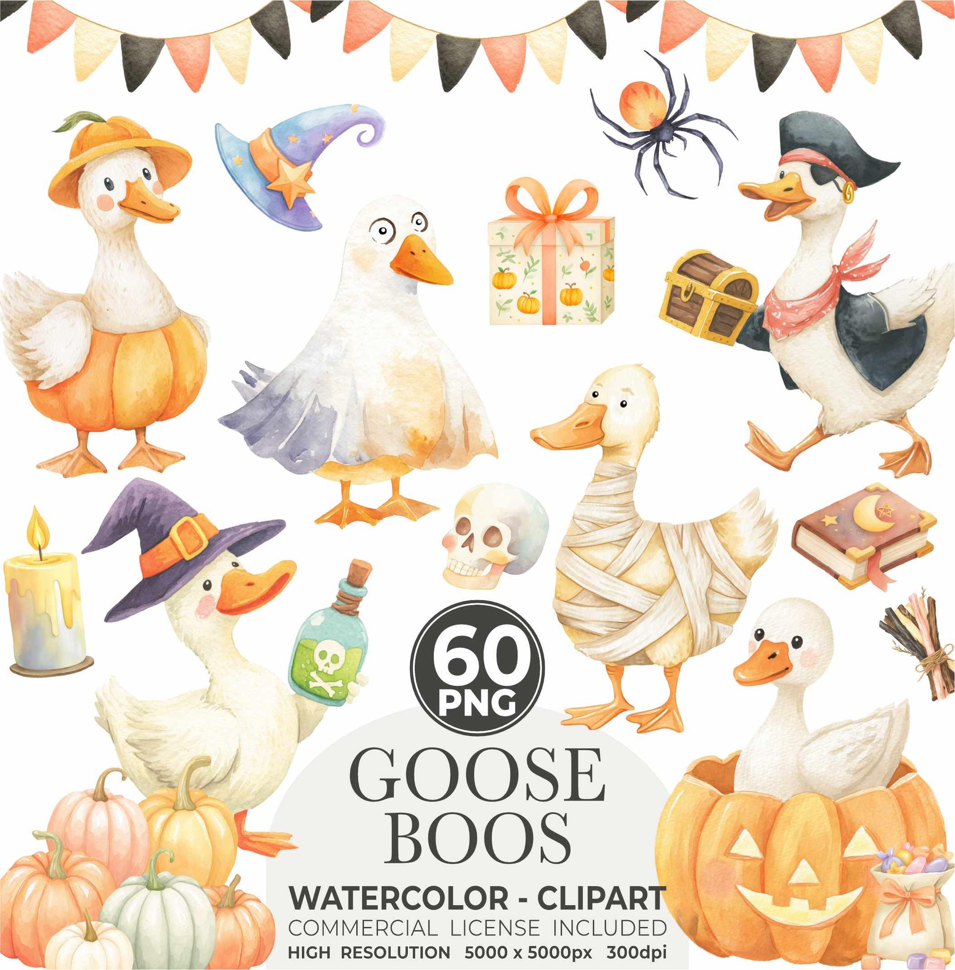 A quirky and charming pastel Halloween set featuring 60 high-quality PNGs — including spooky-silly geese in costumes, pumpkins, cobwebs, bats & more!