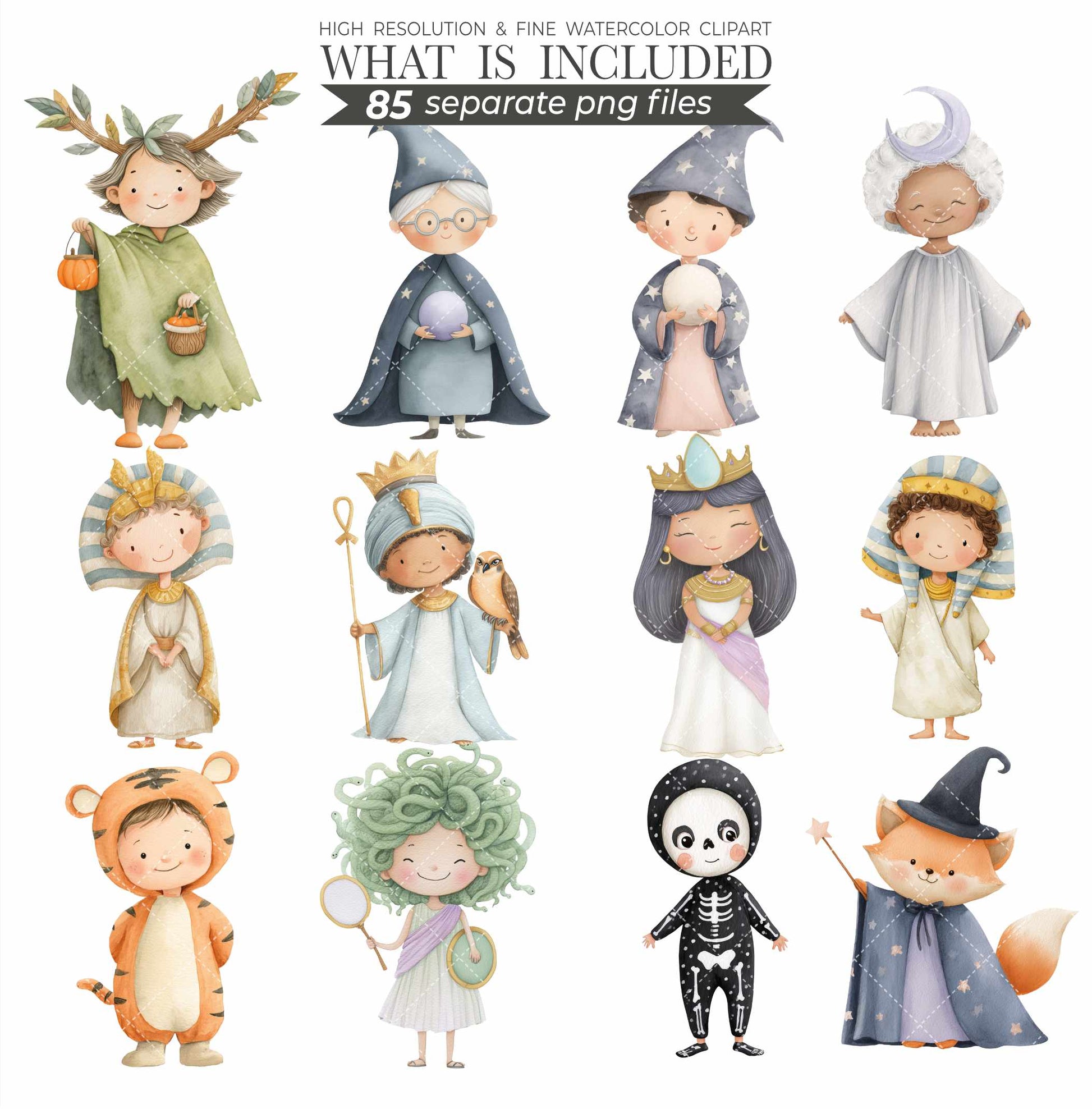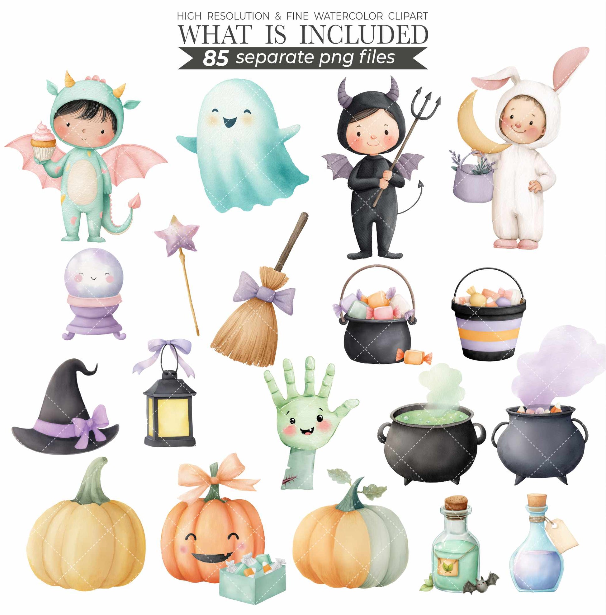 This adorable set features 170 high-quality PNG illustrations of sweet little Halloween characters, including witches, ghosts, black cats, Frankenstein, mummies, pumpkins, bats, and other charming spooky accessories - soft watercolor tones.