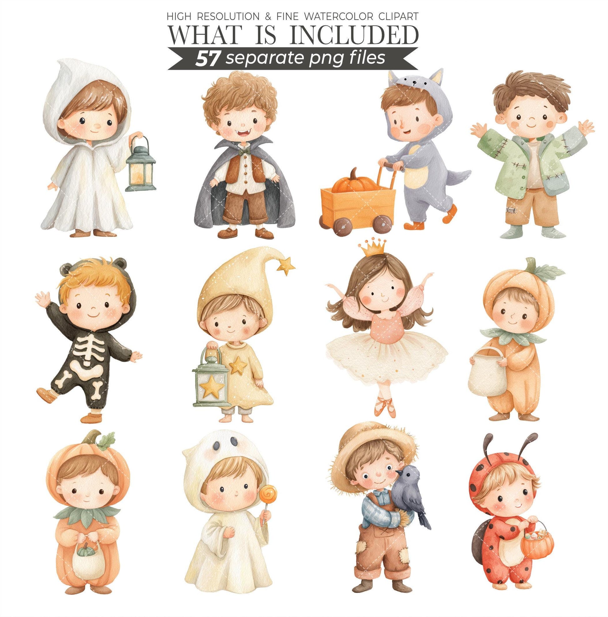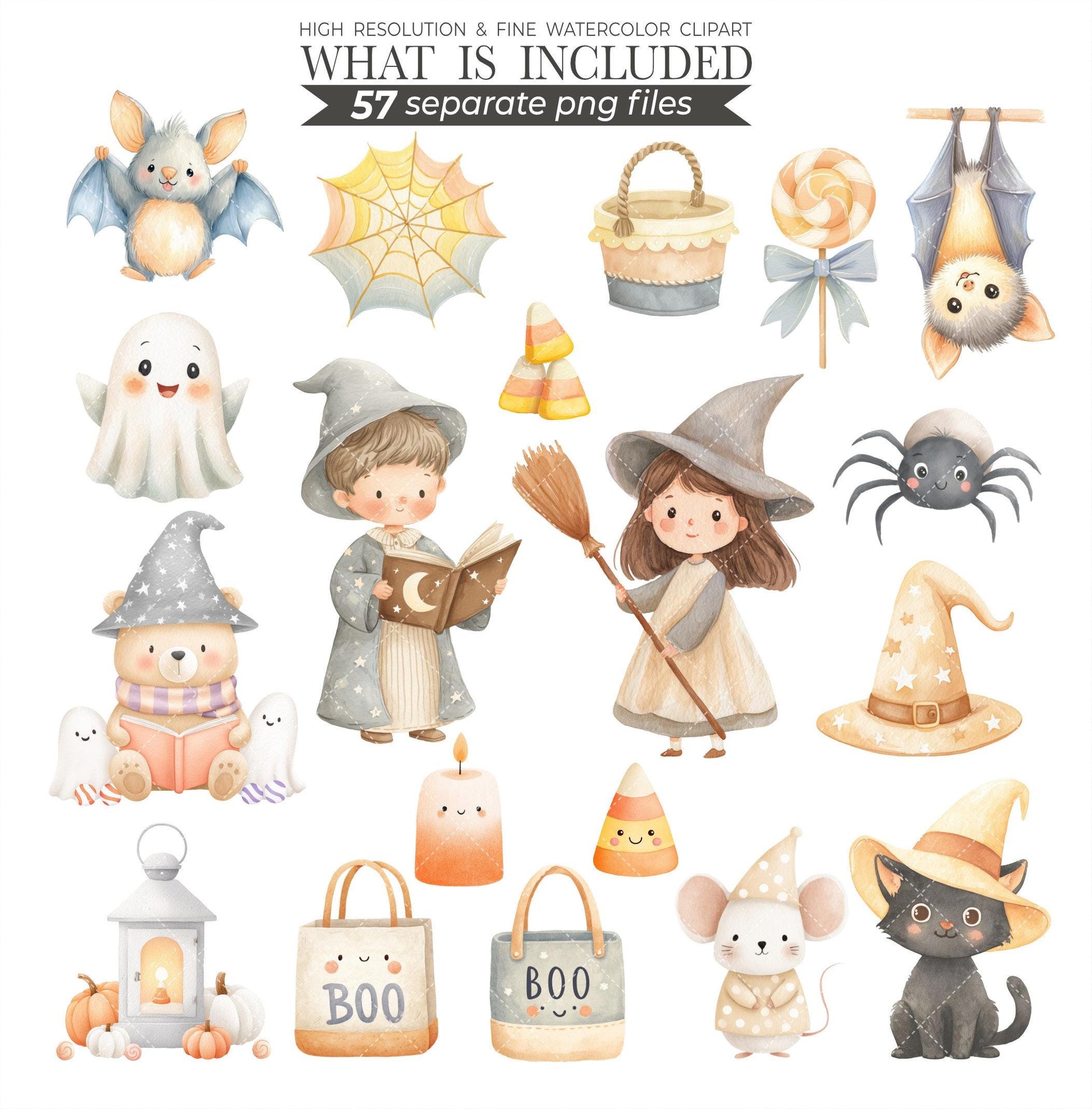 Watercolor Halloween Clipart Bundle: Pastel Ghosts, Pumpkins, Halloween Kids (Digital Download, 114 PNGs)