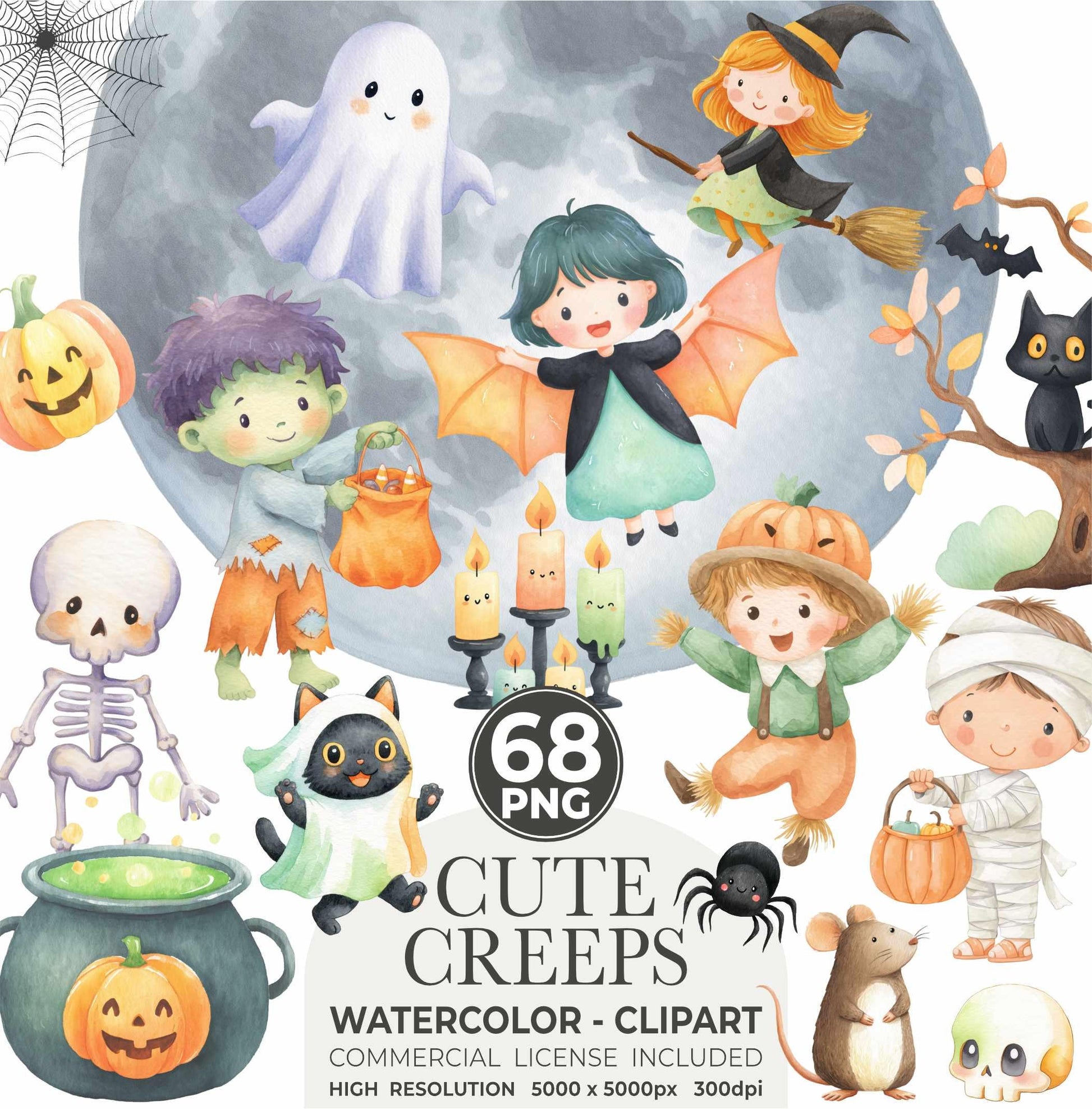 Neutral pastel spooky set featuring 68 high-quality PNGs - includes adorable little ghosts, pumpkins, mummies & more! Perfect for kids' Halloween parties, invitations, decorations, scrapbooking & crafts 🧡