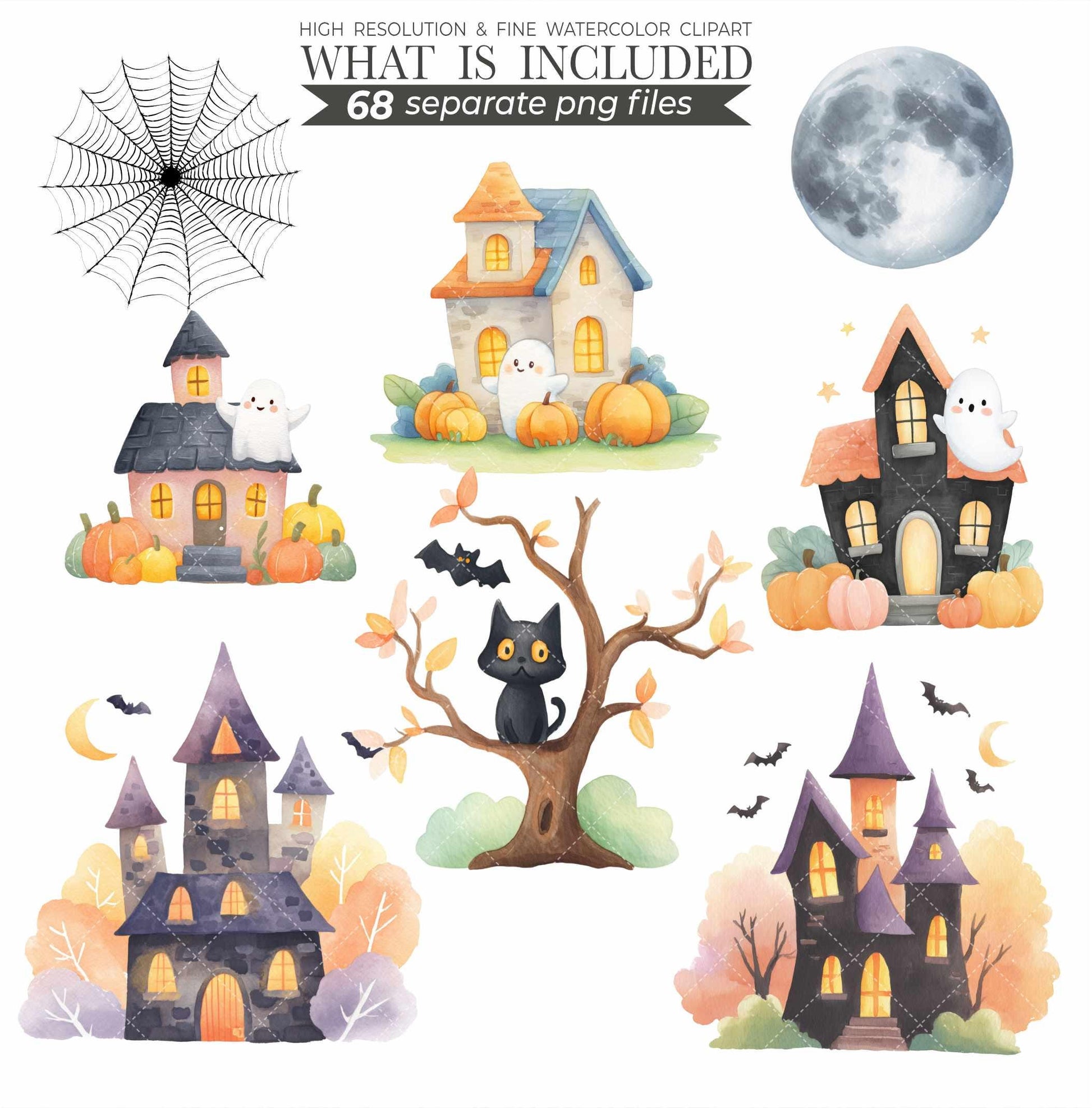 Watercolor Halloween Clipart Bundle: Pastel Ghosts, Pumpkins (PNG Digital Download)