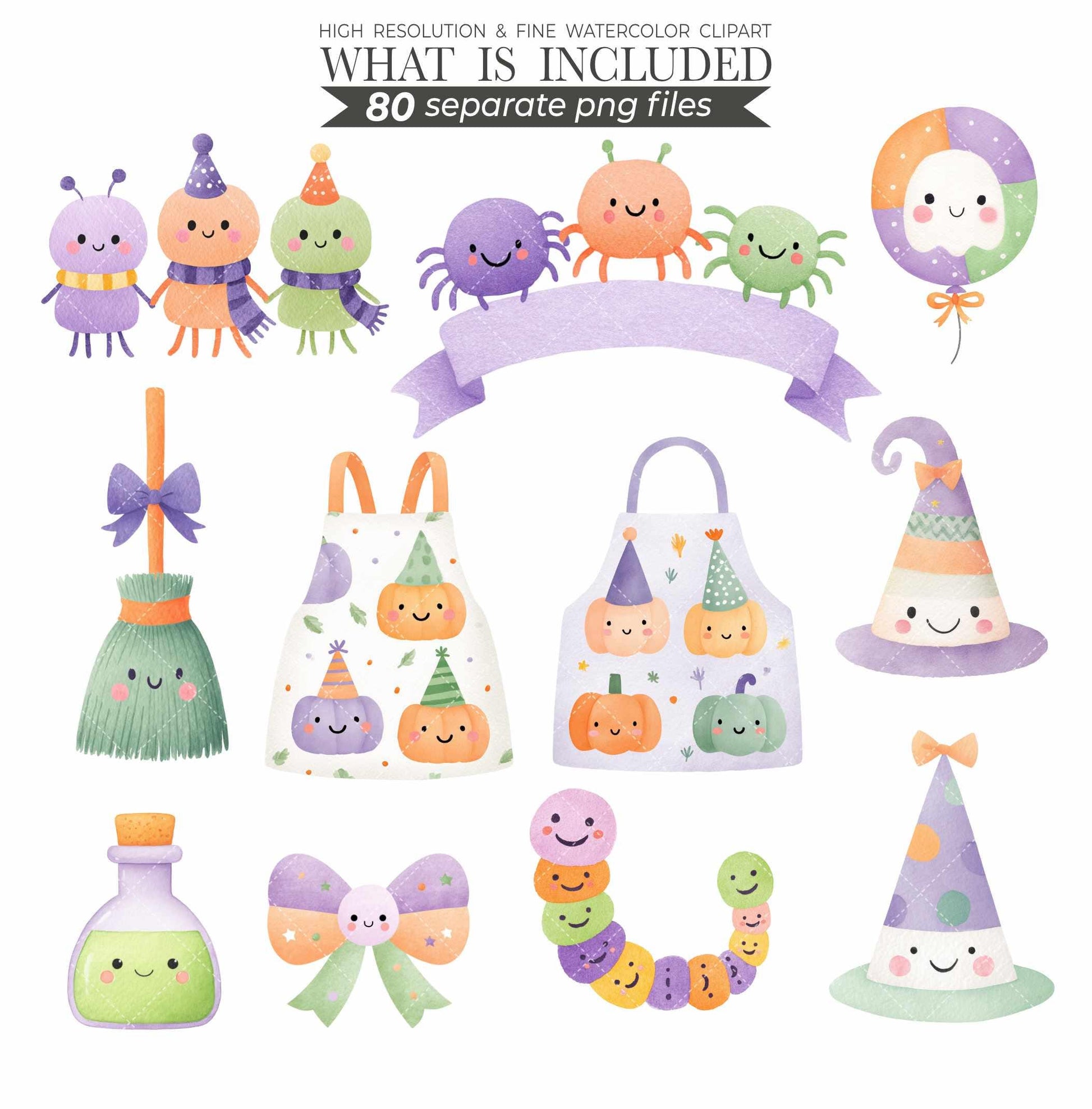 A sweet pastel set featuring baby geese in fun Halloween costumes — witches, mummies, skeletons & more — painted in soft purple, orange, and green watercolor tones.
