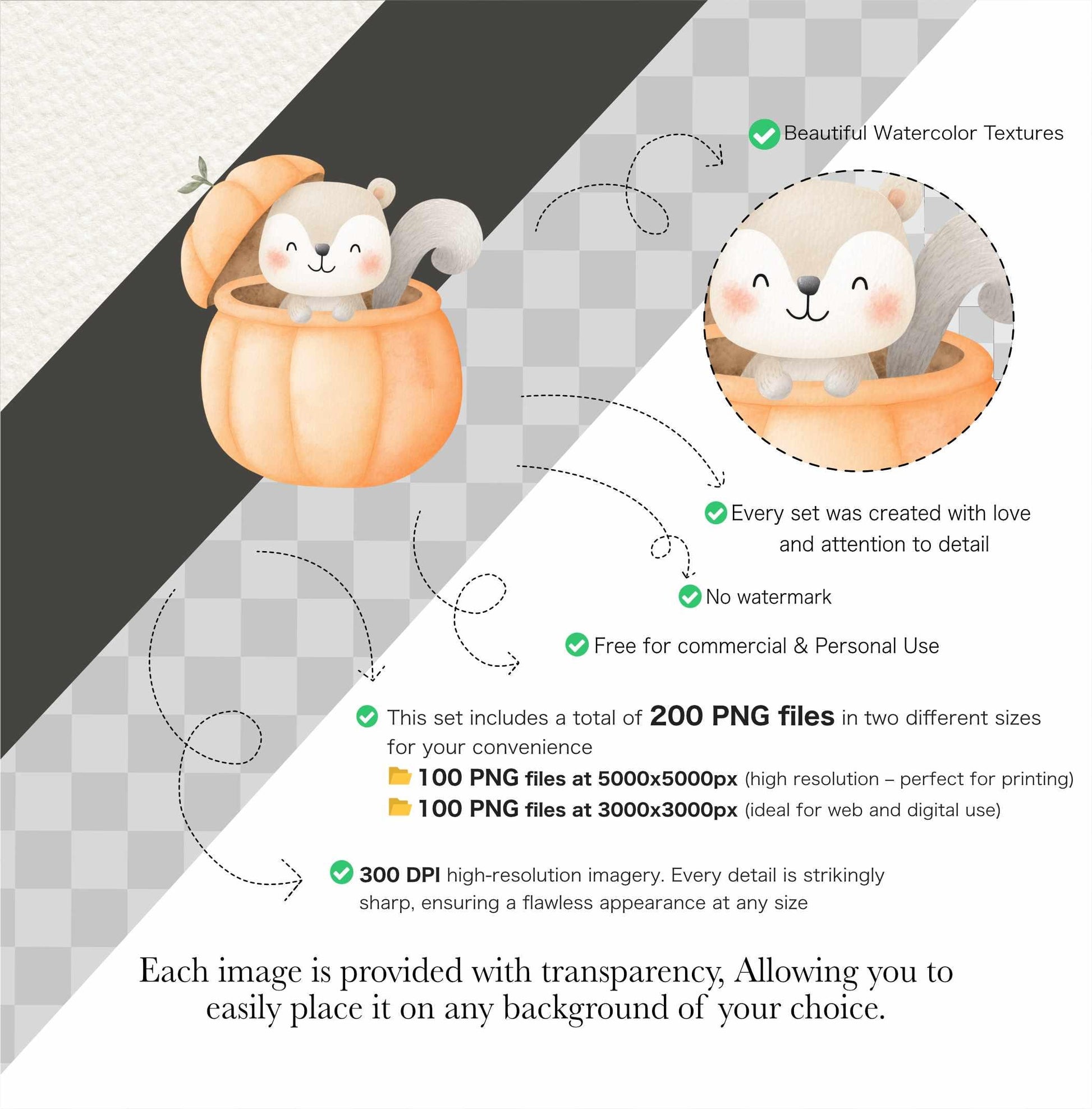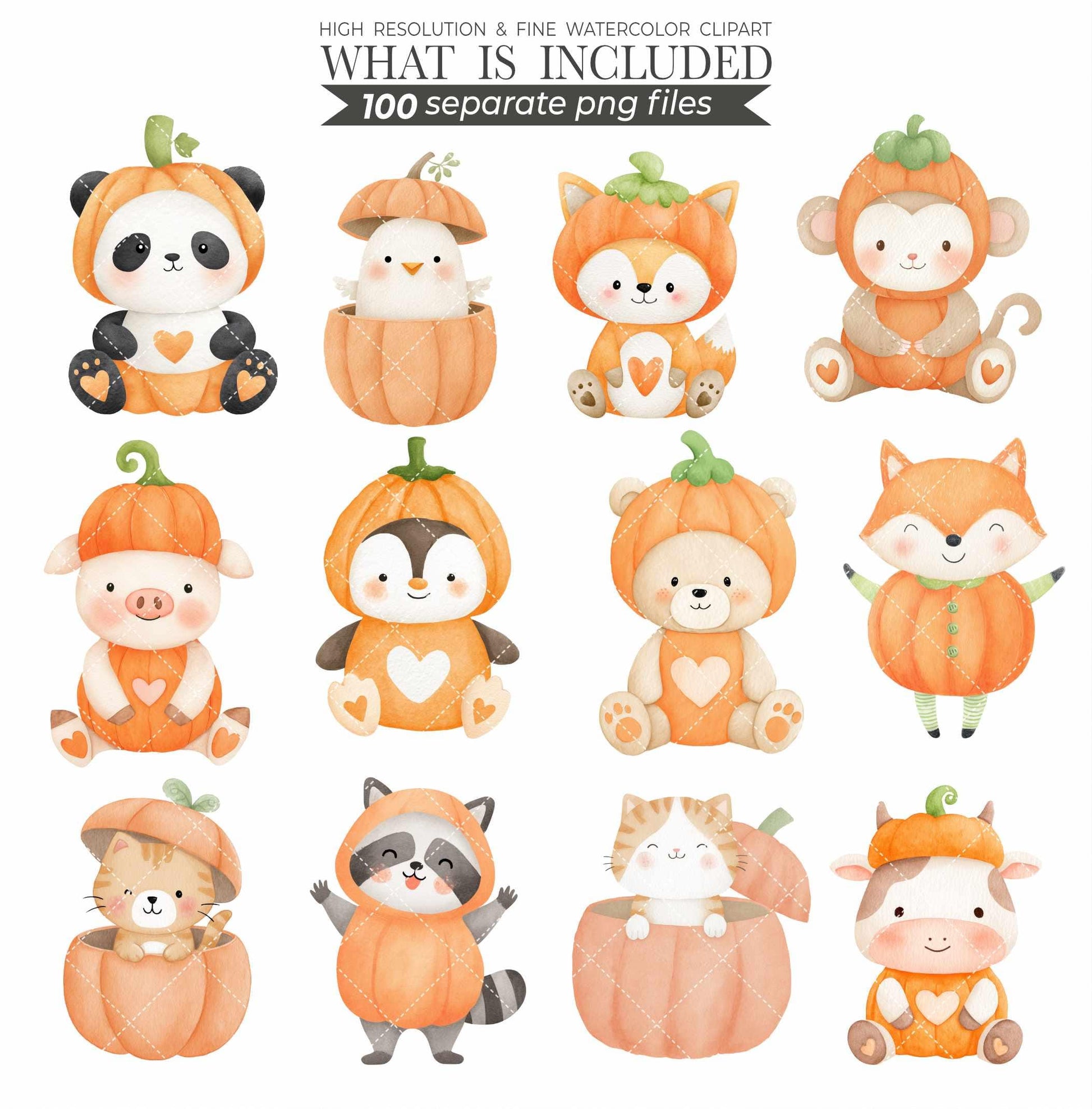 Bring cozy autumn vibes to your projects with this charming collection of 100 high-quality PNG illustrations featuring adorable animals in pumpkin-themed outfits, happy pumpkins, fall leaves, sunflowers, and other seasonal accents — all hand-painted in soft watercolor tones.