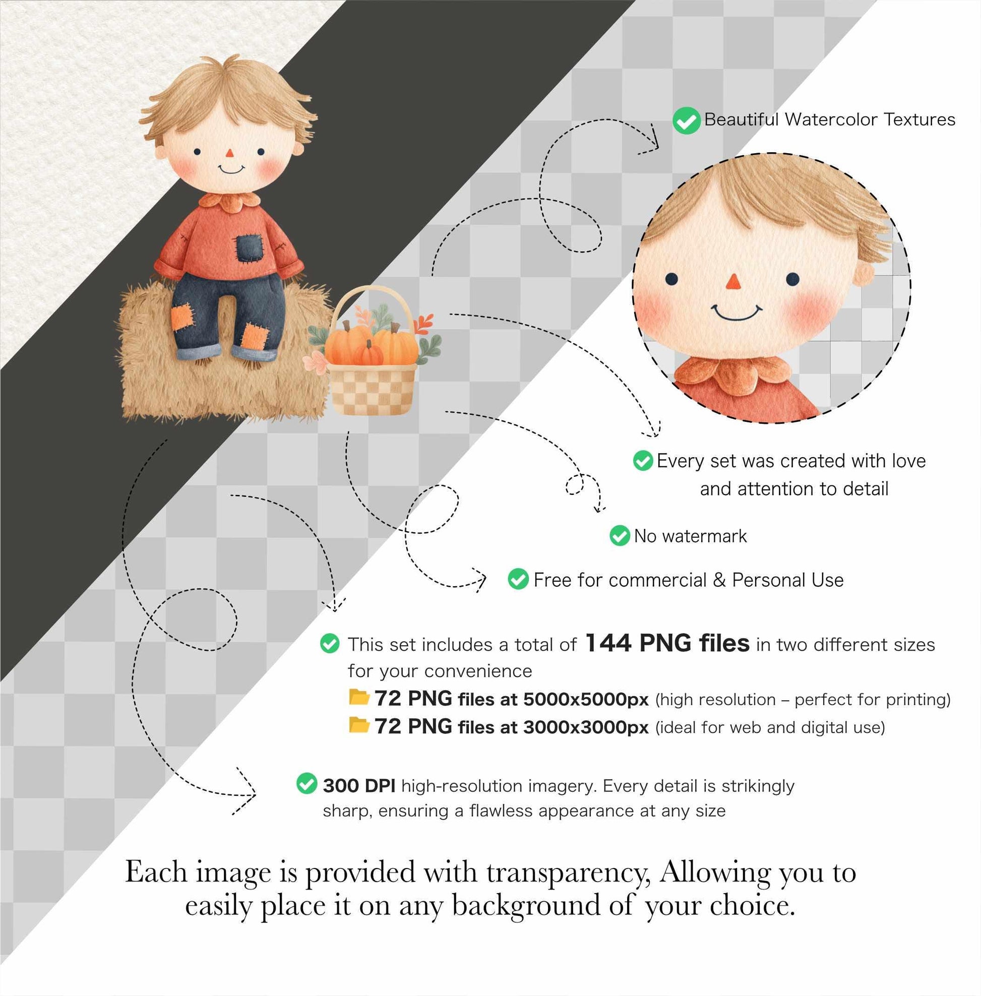Watercolor Scarecrow Clipart Set: Fall Harvest Illustrations (PNG Files, Commercial Use)