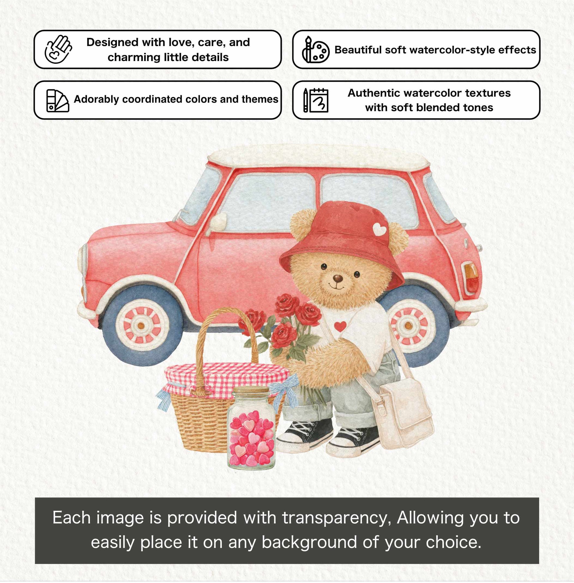 LITTLE LOVER TEDDY BEARS is a cheerful watercolor clipart collection celebrating relaxed, feel-good teddy bear moments with a fresh and distinctive twist.